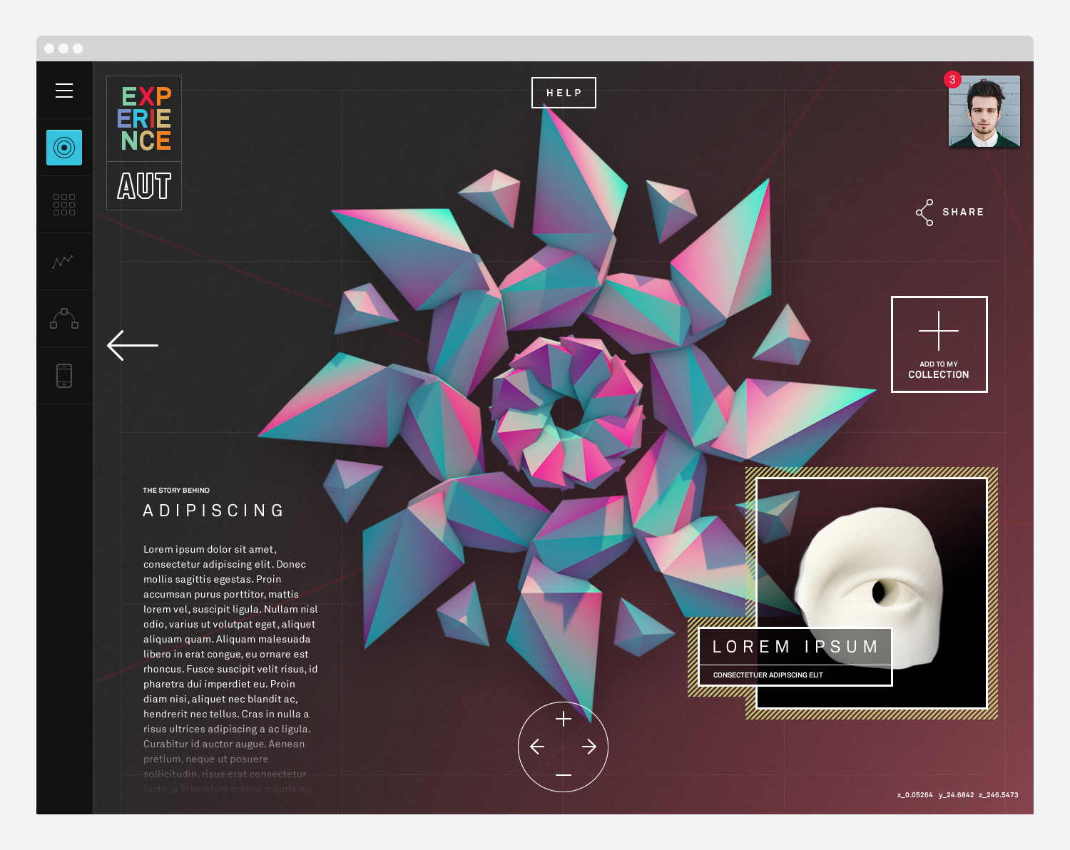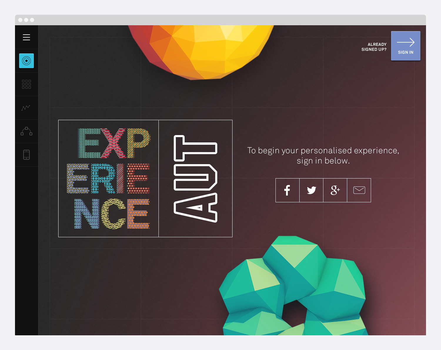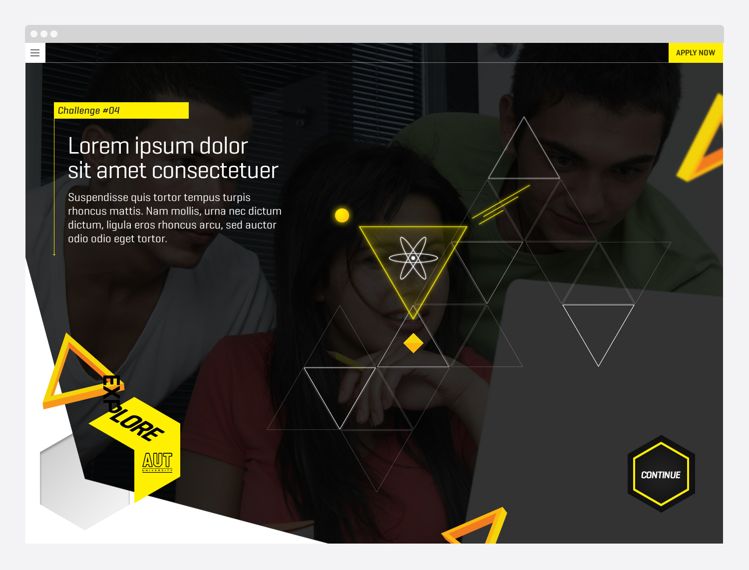 The mark is a stylised S–shape, which gets it's form from an isometric cube or hexagon. The mark was expanded into a rigid geometric visual language to reflect an organised sensibility and the strength of the new platform. The new visual language and colour palette — which purposefully avoided using the core AUT faculty colours — matched the Microsoft design aesthetic.