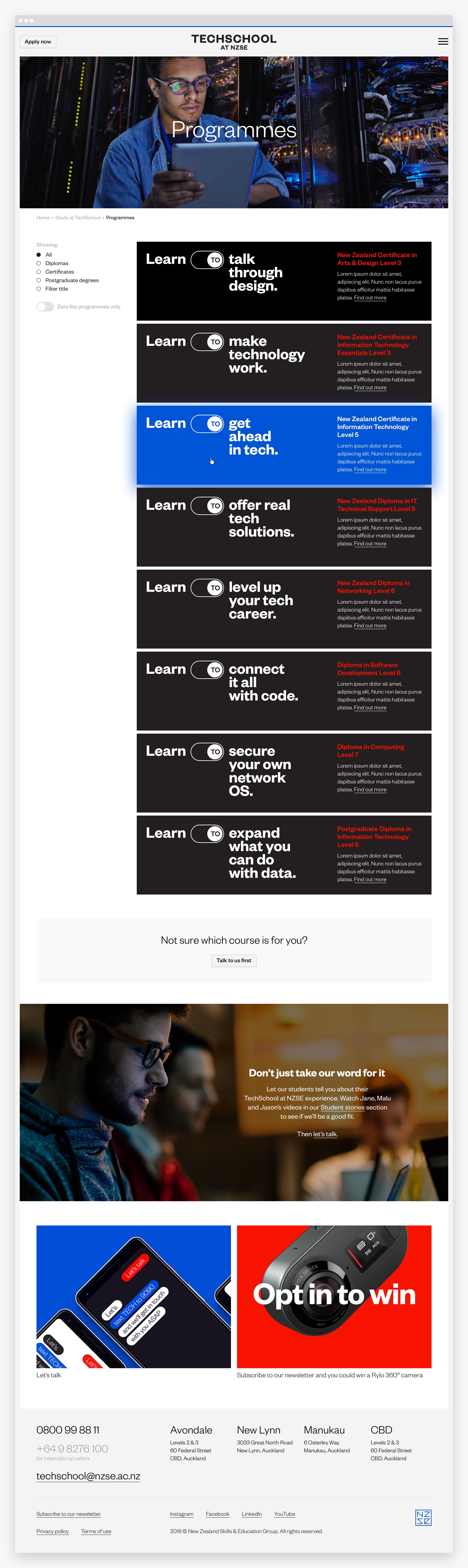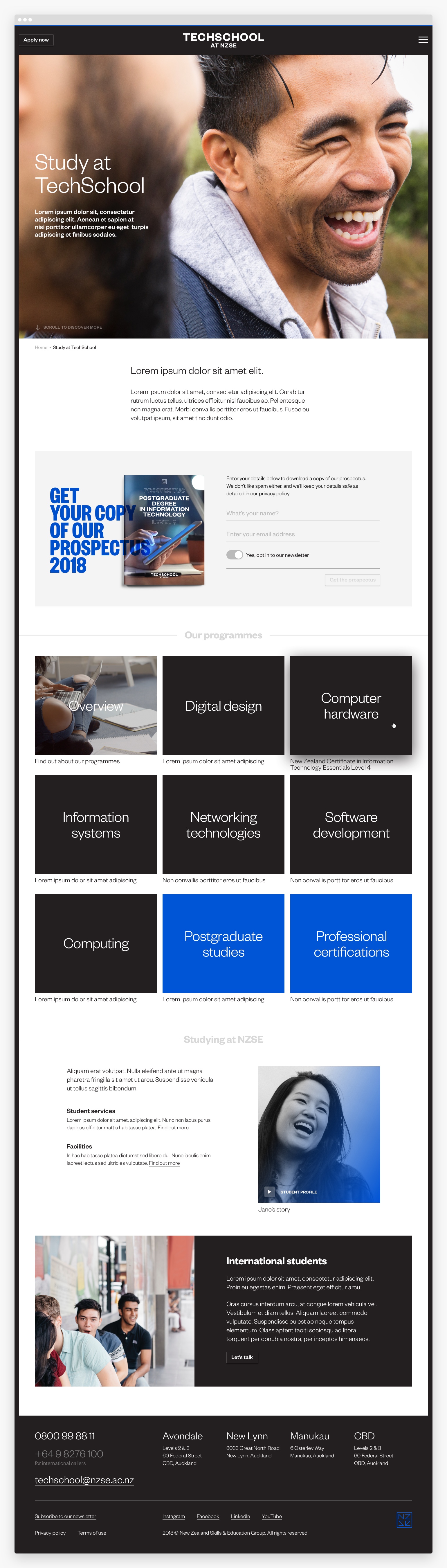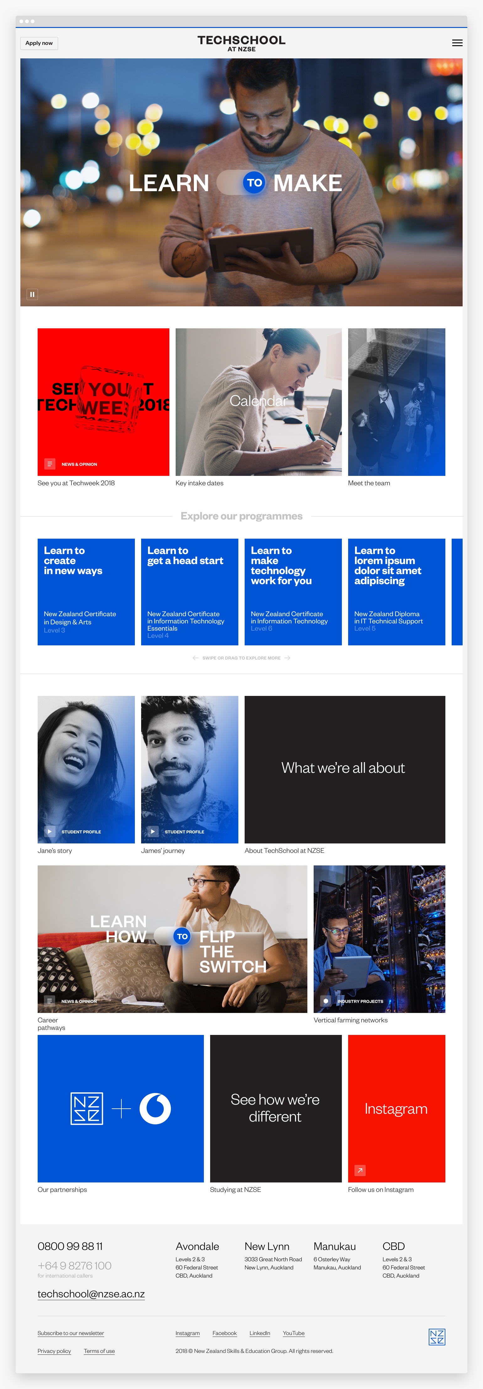 In 2018 I helped NZSE, the New Zealand School of Education, to consolidate their technology–focused programmes under a new umbrella: TechSchool at NZSE. As well as a new logotype and brand, I helped with establishing a new tone of voice, a redesigned website, and a launch campaign focused on ‘flipping the switch.’