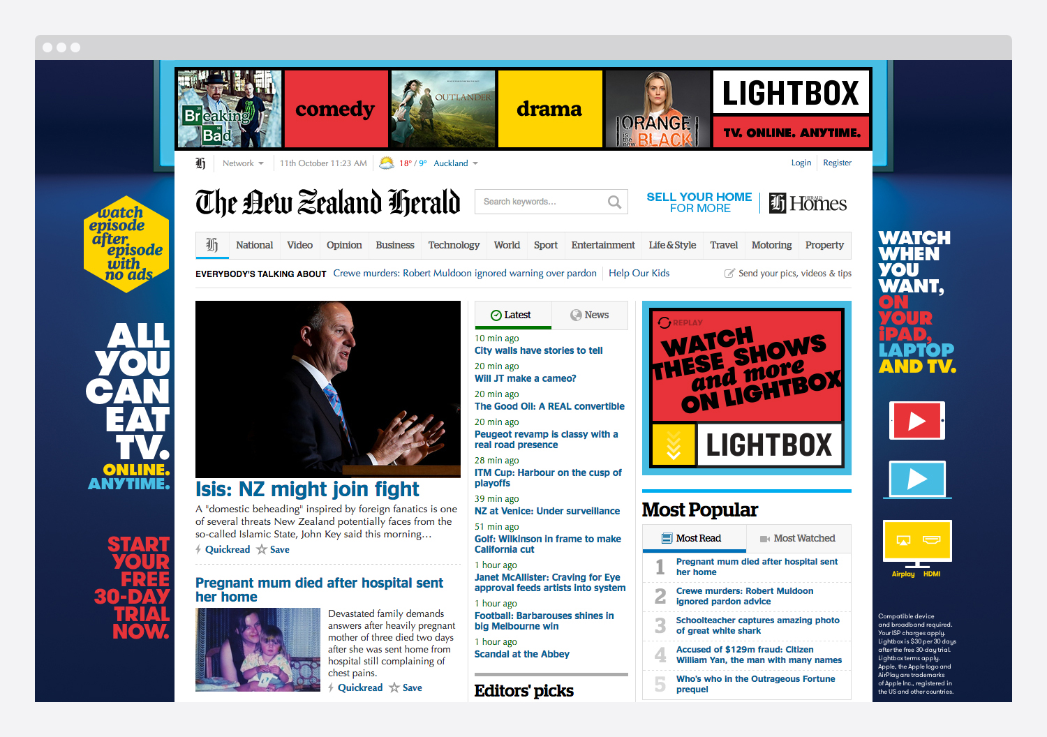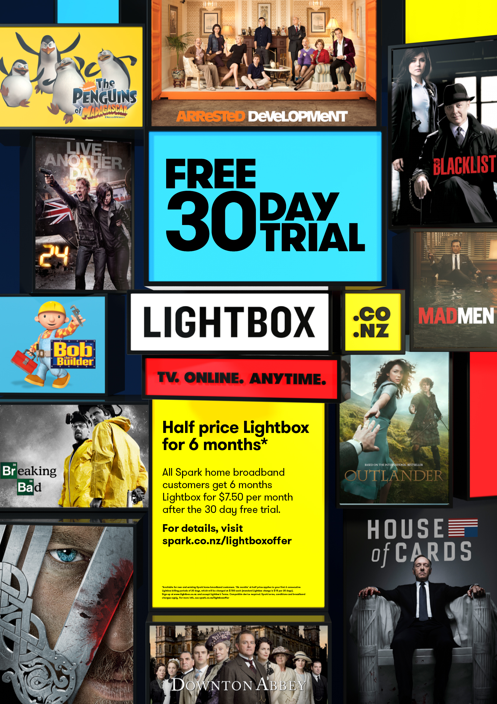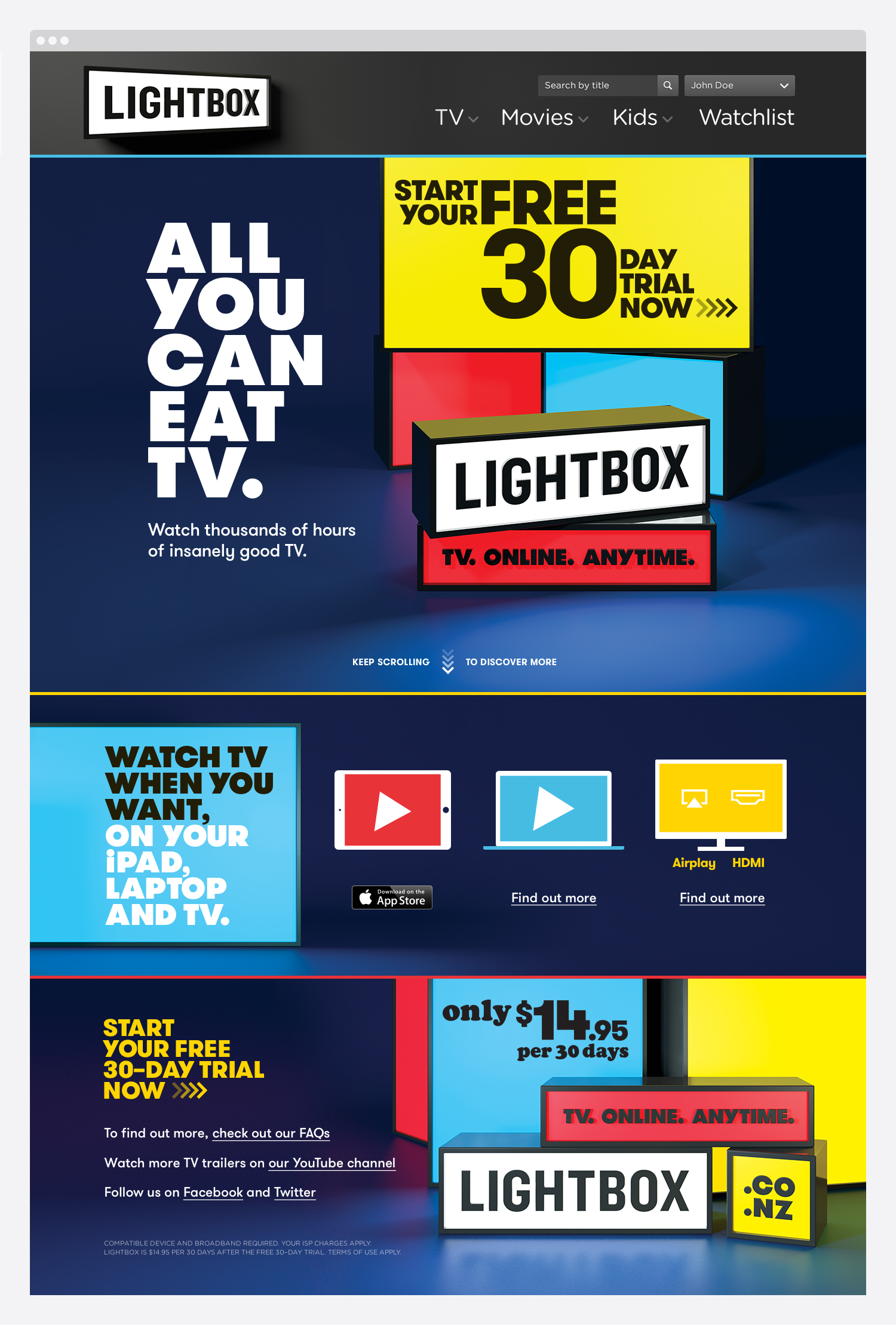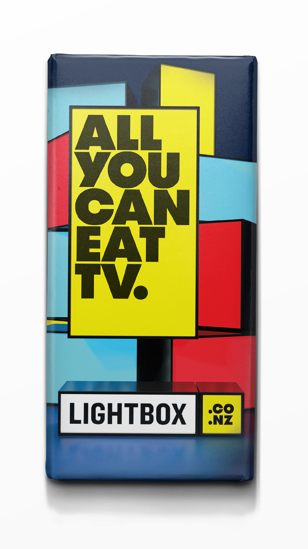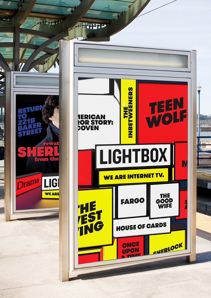 Previously named ShowMeTV, Lightbox is a new online TV service from Telecom Digital Ventures. Consortium was awarded this account after a competitive pitch and is responsible for branding and across–the–line collateral. The logo has been designed as both a two–dimensional brandmark and as a 3D rendered lightbox. The brand elements reference the Dutch art movement neoplasticism from the early 20th century as a happy result of an instruction to retain the yellow and red brand colours established for ShowMeTV.