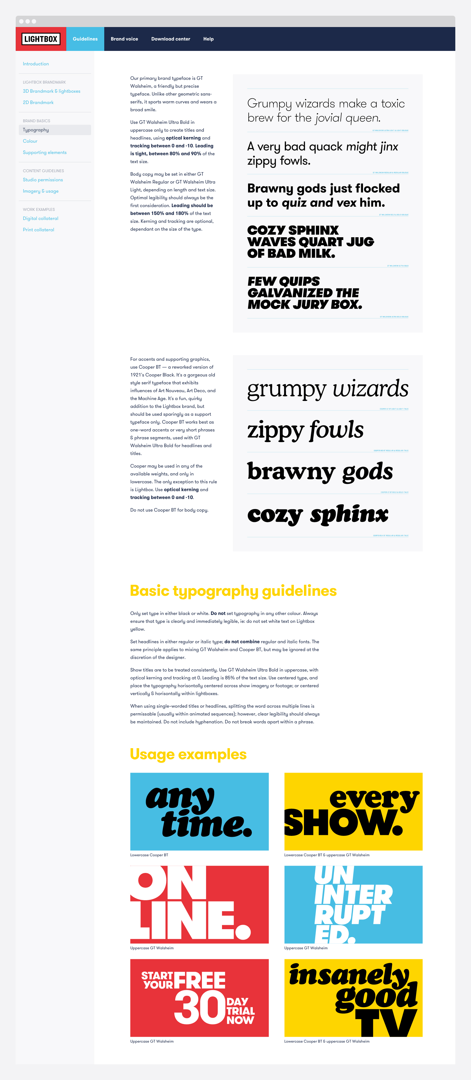 Instead of a static brand guideline document, a brand website was developed. The site was designed to not only house current brand guidelines and usage rules, but contained sections on brand voice; studio permissions and usage rights; a brand asset download center; and a library of past collateral for easy reference.